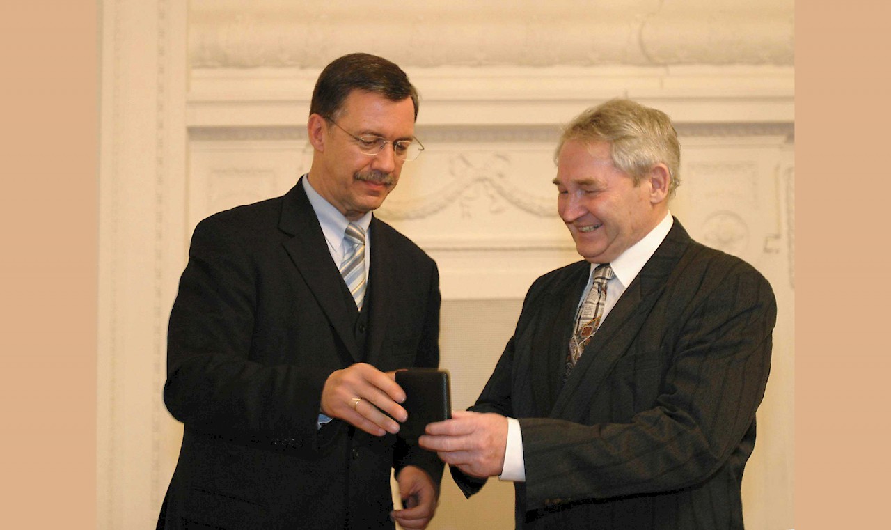 Anton Reck erhält die Wirtschaftsmedaille des Landes Baden-Württemberg als Zeichen der Anerkennung für besondere Verdienste um die Wirtschaft, überreicht von Wirtschaftsminister Dr. Walter Döring.